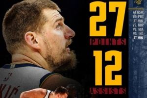 > 赛季个人第七次三双!掘金官方晒约基奇本场数据:27分10板12助!