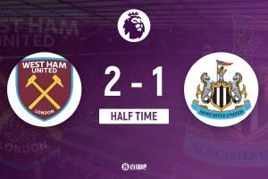 上半场比赛结束,西汉姆联2-1纽卡斯尔联。